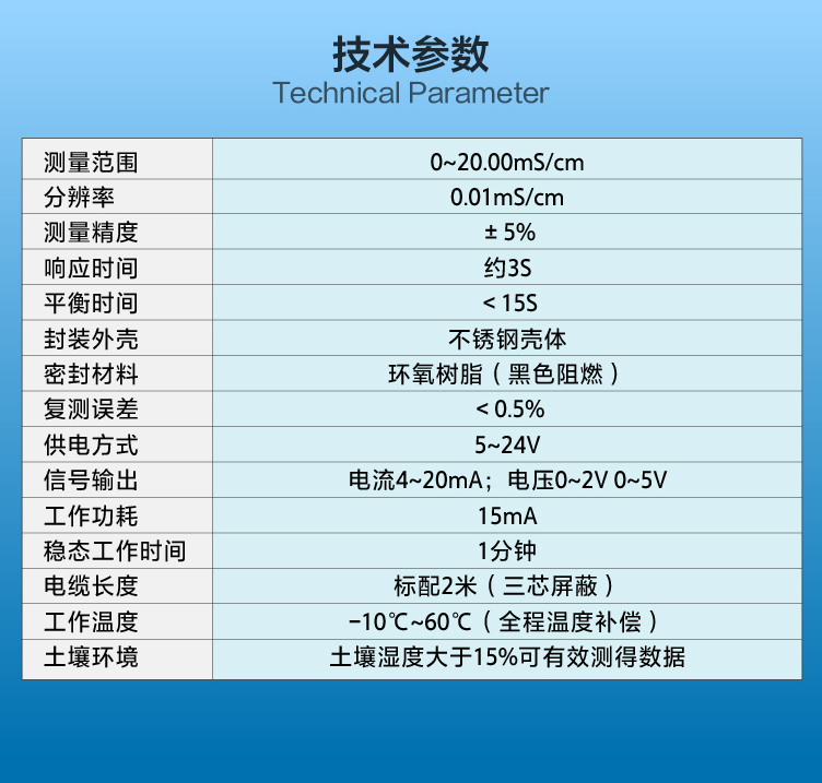 DC-TY2土壤鹽分傳感器是一款功能強(qiáng)大的監(jiān)測(cè)設(shè)備,它通過(guò)不銹鋼探針和精密溫度傳感器,將土壤中的鹽分轉(zhuǎn)換成模擬或數(shù)字信號(hào)輸出。該傳感器體積小巧、測(cè)量精度高、響應(yīng)速度快,并具備優(yōu)良的密封性和耐腐蝕性,可直接埋入土壤中使用。廣泛應(yīng)用在農(nóng)業(yè)、環(huán)境保護(hù)、科研等方面。